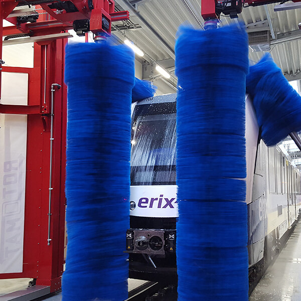 4-Bürsten-Straßenbahnwaschanlage (kein Portal, Oberleitung frei), 2 Seitenbürsten und 2 Dach / Vautenbürsten