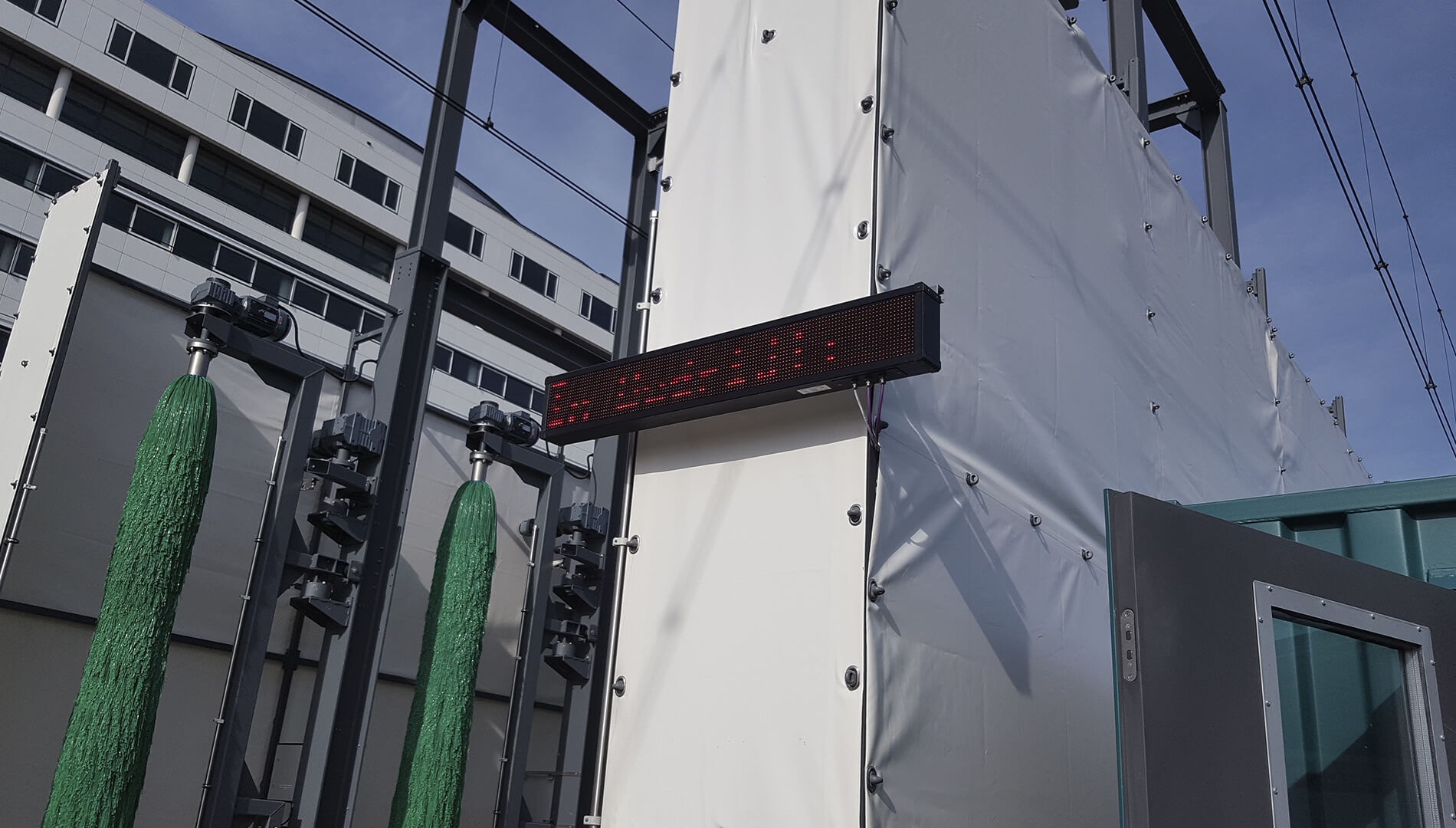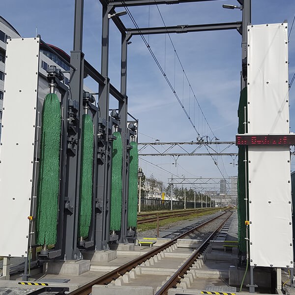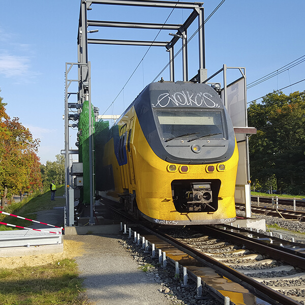 Washes the lateral surface and the edge areas of the roof fast and careful. The swivel and automatic avoiding brushes guarantee a gentle washing of the vehicle surfaces without risk of damage. The vehicle drives under its own power through the washing system. Therefor for the washing system it is just necessary to have a placement area of approx. 7 x 10 m. The construction of the washing system is so laid out that the vehicles can be washed during the shunting activities in the railway area with a passage speed up to 20 km/ h. This ensures that the availability of the trains is significantly increased because it is not necessary for them to stay for several hours in an external cleaning because they become washed during as they pass.