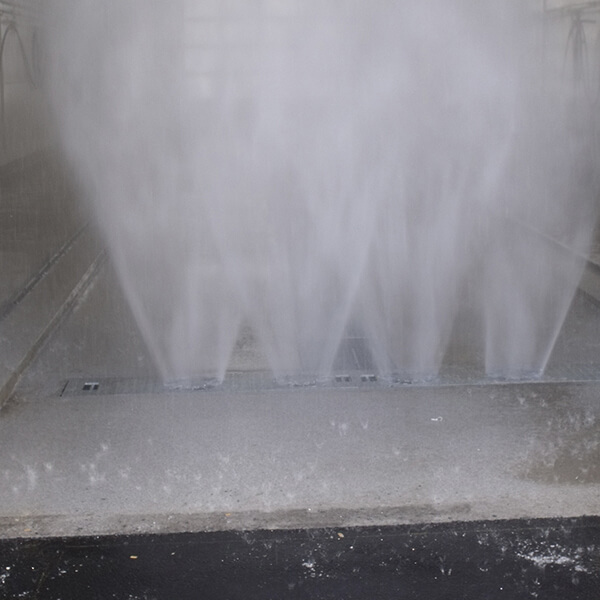 Stationärer Einbaurahmen mit 4 hydraulisch angetriebenen Hochdruckköpfen zur Reinigung des Unterbodens von PKW, Bussen, LKW, Kleintransporter und sonstigen Fahrzeugen während der Überfahrt. Durch die rotierenden Köpfe wird die Reinigung der Flächen optimiert. Automatische Aktivierung mit Lichtschranke oder Induktionsschleife.